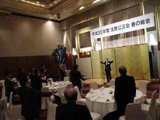 総会の部は、平川敏彦新公正会幹事長の挨拶に始まり、平成21年度決算及び平成22年度予算の報告、塩路広海前副会長、森本宏新副会長のスピーチが行なわれた後、宴会の部となりました。