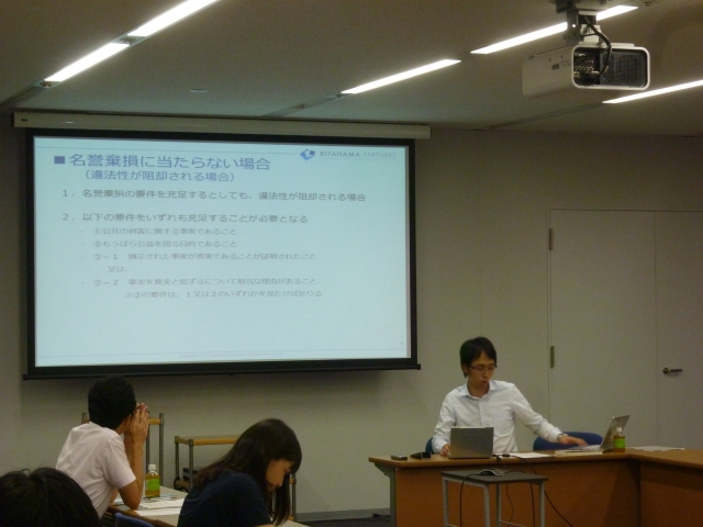今回は、山田幸太朗先生(64期)を講師にお迎えして、「インターネット上の名誉棄損に対する実務対応」と題し、インターネット上の名誉棄損的表現に対する対抗措置についての講義をしていただきました。